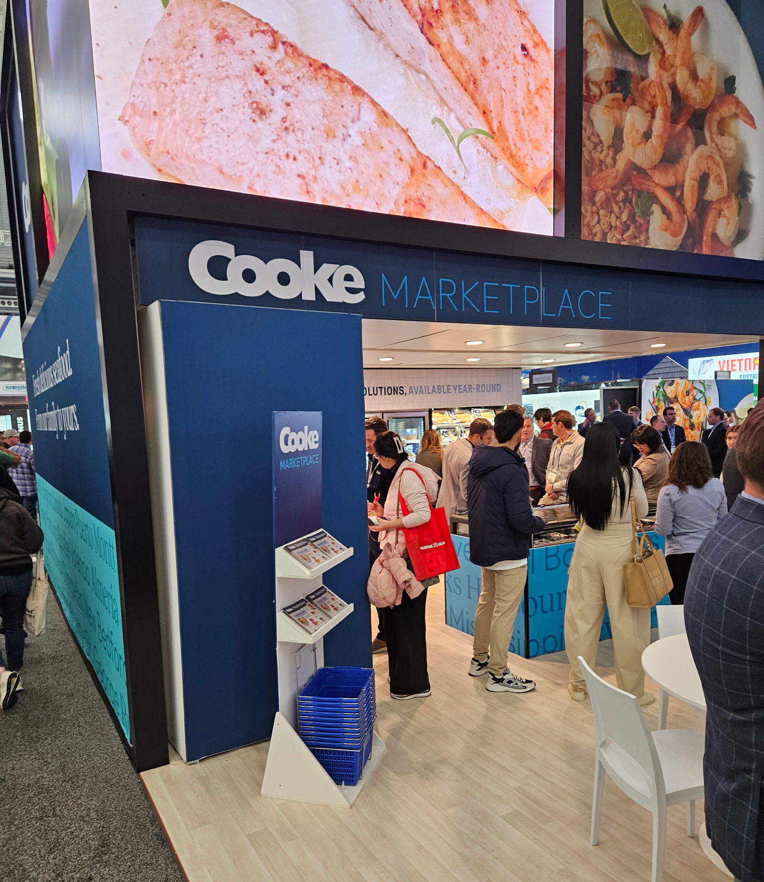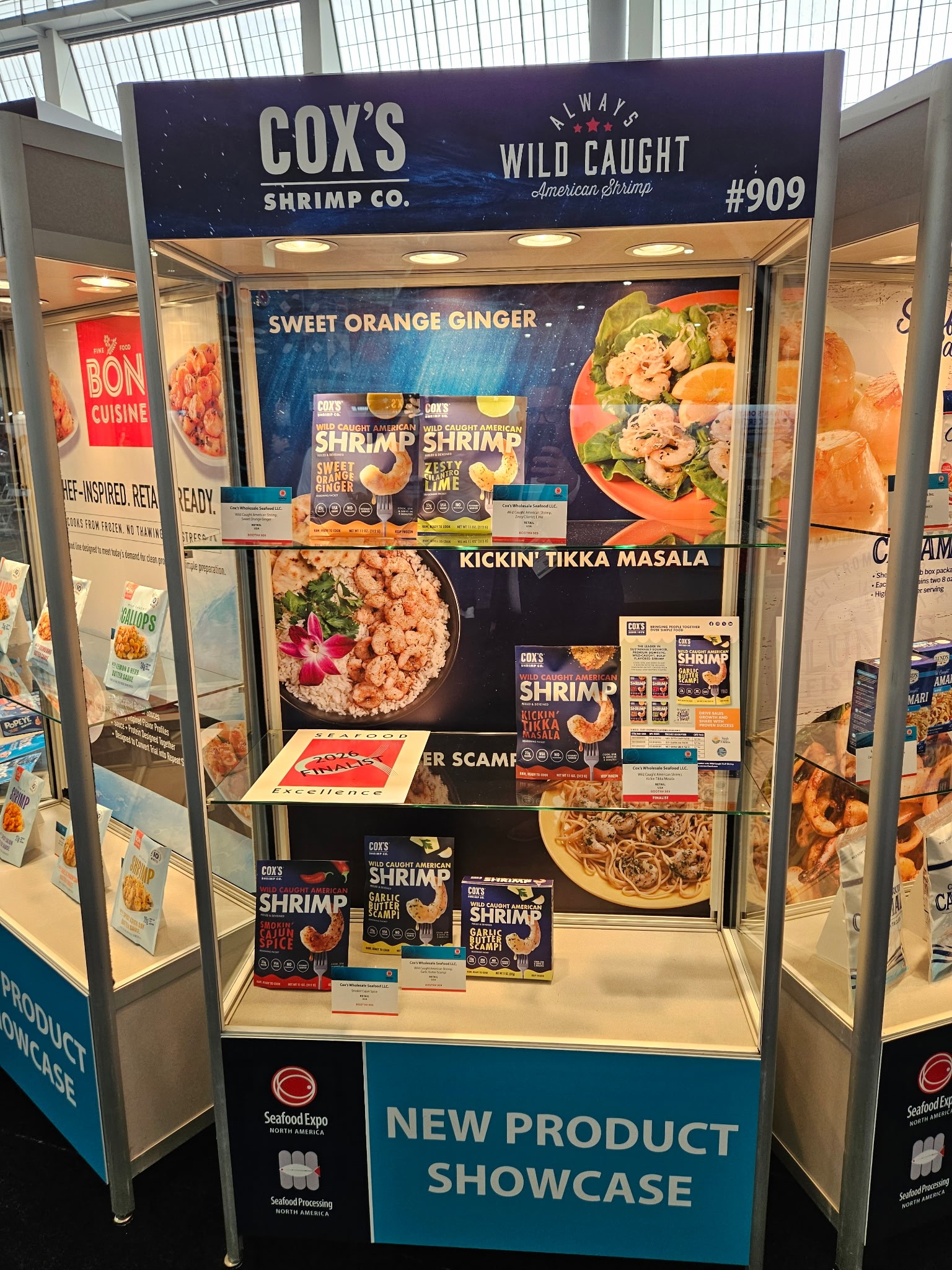 Beyond the conversations, the show floor reflected a mix of scale and innovation. Larger companies like Cooke made a strong impression with their presence (hello two-story booth) and breadth of offerings, while others, like Cox’s Seafood, focused on highlighting new value-added Gulf shrimp CPG products.